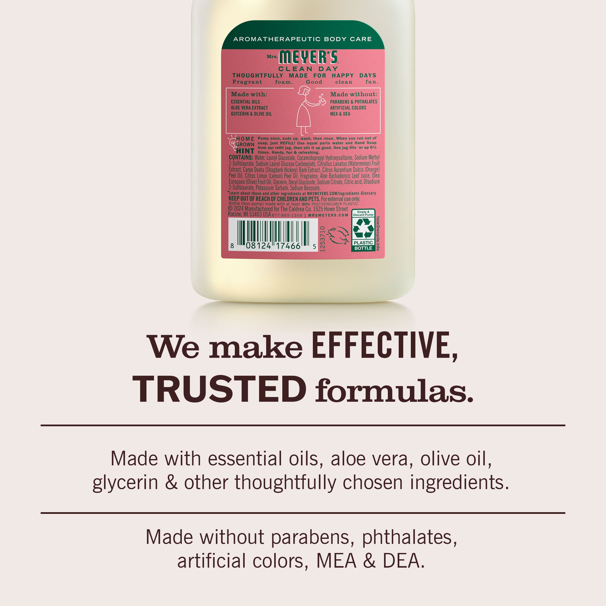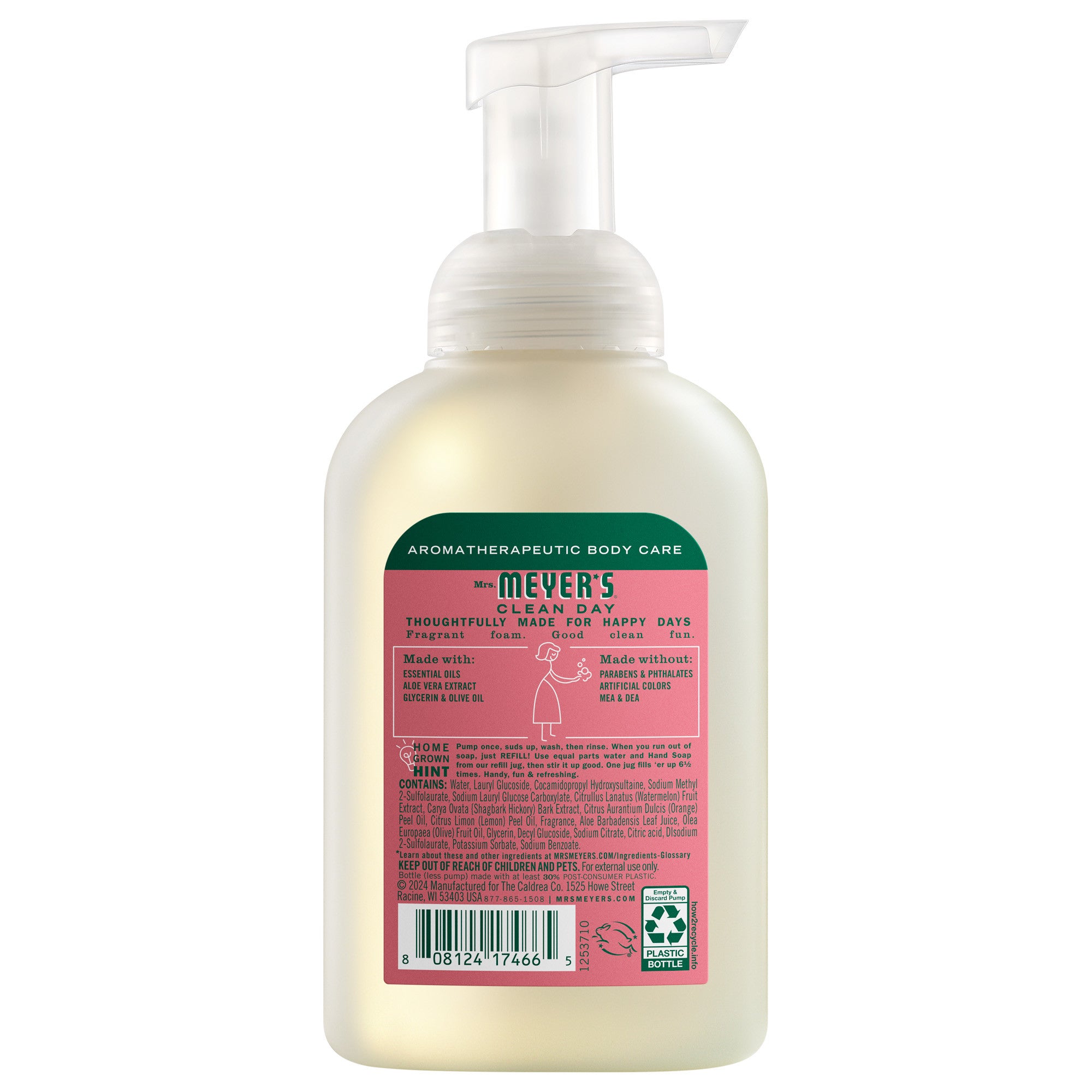 Mrs. Meyer’s Clean Day foaming hand soaps are specifically made to clean and freshen hands without over drying, while also providing a special, singular scent for your home. Fresh from the garden, the juicy Watermelon scented soap treats your senses to one of summer's simple, sunny pleasures. A scent so gently sweet and refreshing. It's a fun treat for all! This hardworking foaming hand soap contains a special formula of plant derived cleaning agents, olive oil, aloe vera, essential oils, and other thoughtfully chosen ingredients that clean and freshen hands. Make washing up fun and easy for the whole family! Mrs. Meyer’s – Rooted in Goodness.