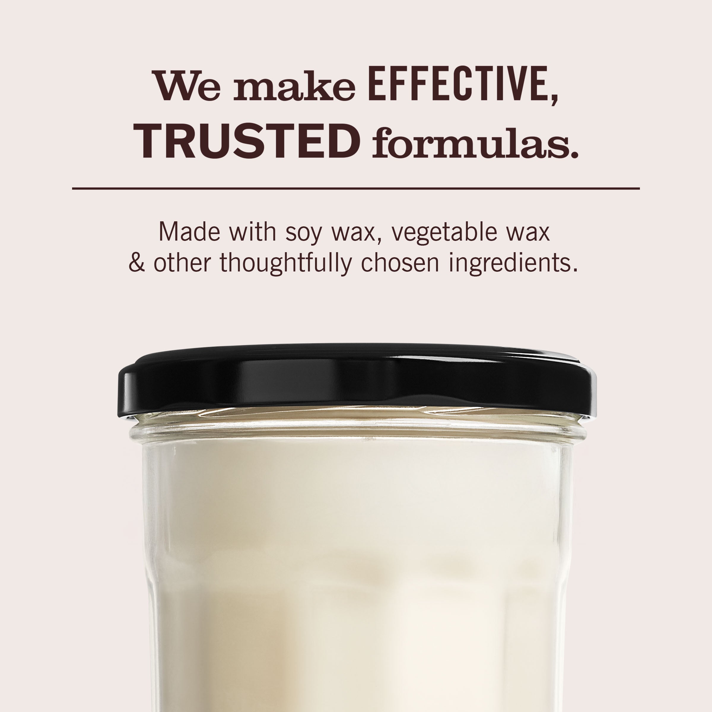 WARNING: To prevent fire or injury: Burn within sight. Never burn a candle on or near anything that can catch fire. Keep out reach of children and pets. Do not use if glass is chipped or cracked. Trim wick to ¼” (6 mm) before each lighting. Keep candle free of matches and all material. Do not burn on cold, wet or unstable surfaces. Burn away from drafts. Never touch or move while lit, or until wax hardens. Never burn more than 4 hours. Stop using when ¼” (6 mm) of wax remains. Do not extinguish with lid or water. Do not reuse. Recycle glass jar after use.