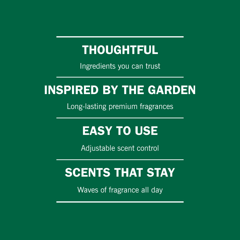 • PREMIUM AIR FRESHENER: An elegantly designed wall plug in with fluted, glass refill jars and your favorite fragrances inspired by the garden.