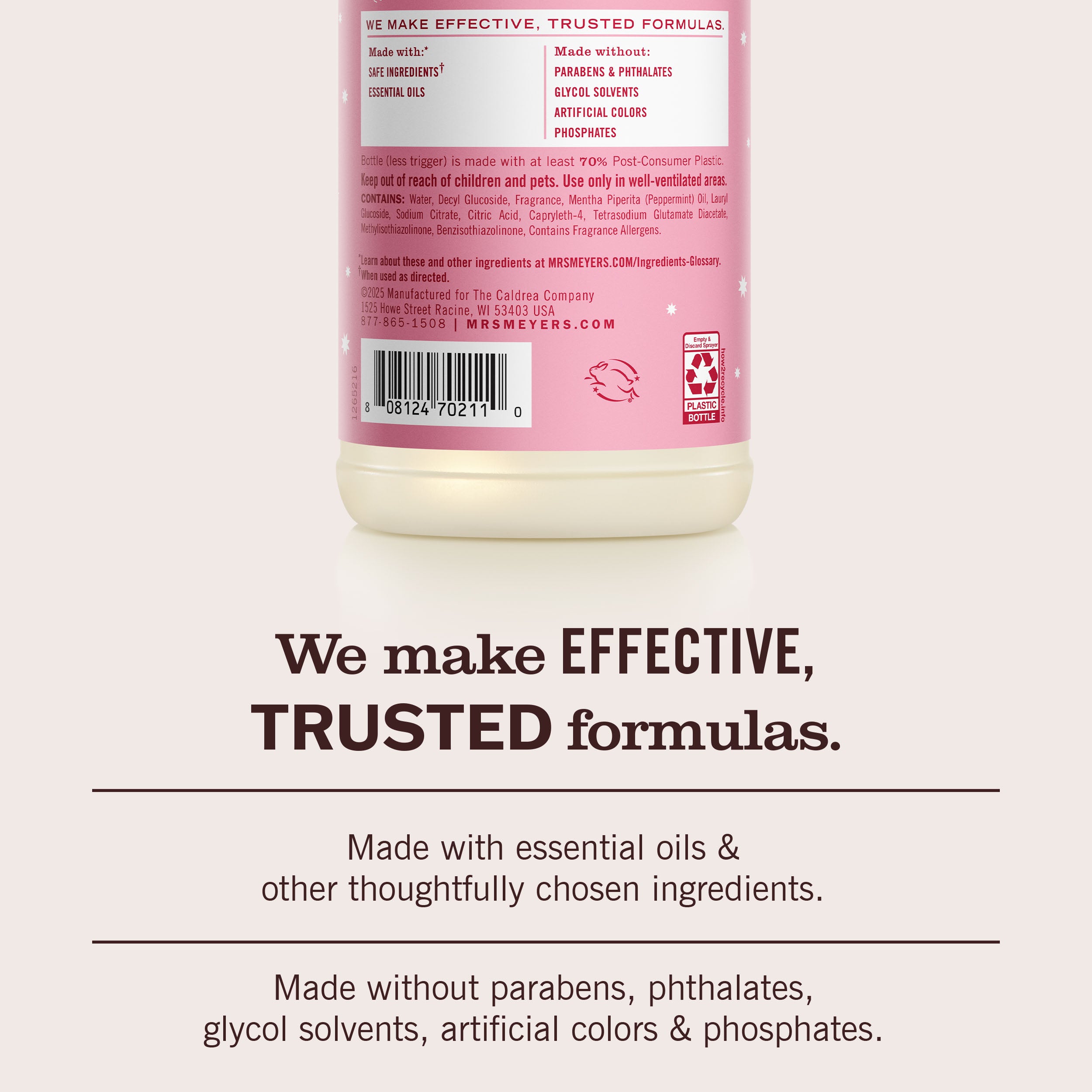 Mrs. Meyer’s Clean Day Multi-Surface Everyday Cleaners feature hard-working yet gentle multi purpose cleaning agents, while also providing a special, singular scent for your entire home. Peppermint scented cleaner with a hint of vanilla smells perfectly heartwarming. Imagine the sweet pleasure of a candy cane in a cup of hot cocoa. What could be nicer? We combine garden inspired scents, essential oils, and plant-derived multi purpose cleaning ingredients to clean kitchen messes and all over the house. Mrs. Meyer’s – rooted in goodness.