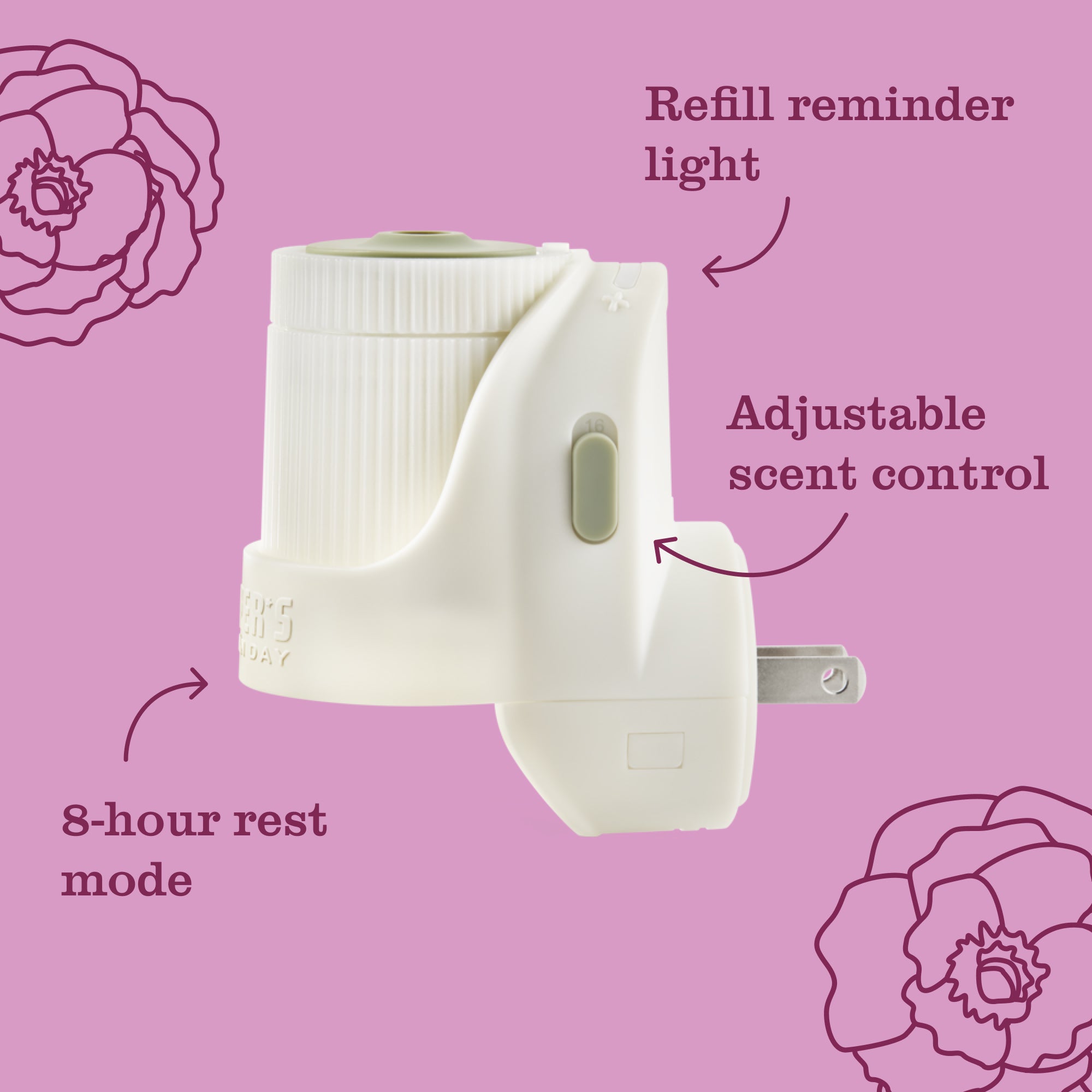 HOUSEHOLD HINT 1. Rotate warmer’s bottle and insert into warmer. 2. Unscrew cap from fragrance electrical plug, if needed. 3. Insert warmer upright into outlet, keep fragrance bottle upright at all times. 4. Read safety and use instructions included with warmer. Adjust warmer intensity to desired setting.