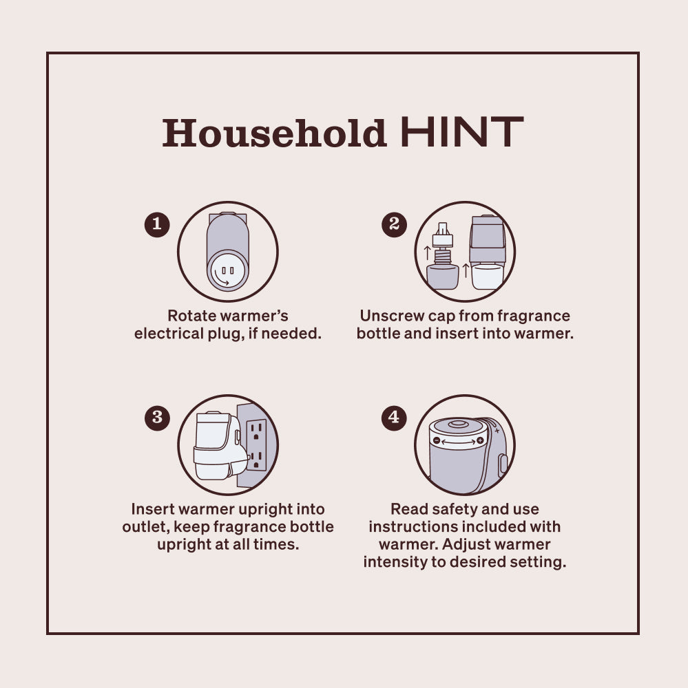 HOUSEHOLD HINT 1. Rotate warmer’s bottle and insert into warmer. 2. Unscrew cap from fragrance electrical plug, if needed. 3. Insert warmer upright into outlet, keep fragrance bottle upright at all times. 4. Read safety and use instructions included with warmer. Adjust warmer intensity to desired setting.